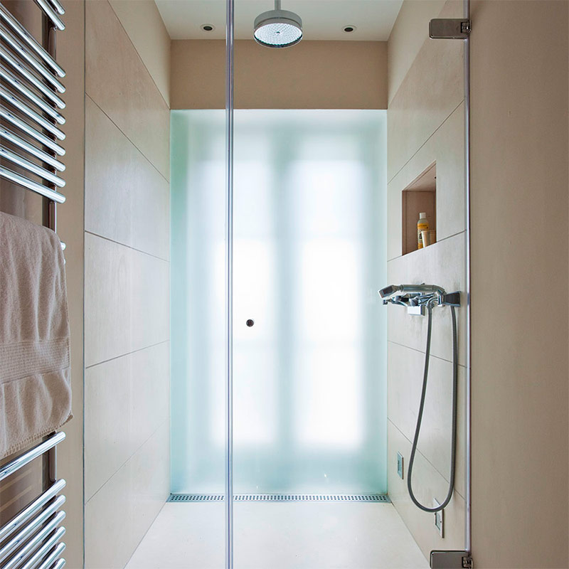 Dans une salle de bain étroite, la façon la plus rationnelle d’utiliser cet espace peut être d’installer une cabine de douche qui occupe toute la largeur de la pièce. Mais que se passe-t-il si la pièce a une fenêtre? La solution idéale pour les conditions données est illustrée ici: le panneau arrière de la cabine de douche est en verre dépoli, qui protège la fenêtre des éclaboussures et offre le niveau nécessaire de dissimulation à l’écoute des regards indiscrets, tout en laissant passer suffisamment de lumière naturelle.Une pomme de douche montée au plafond et une porte de douche sans cadre complètent le look élégant.