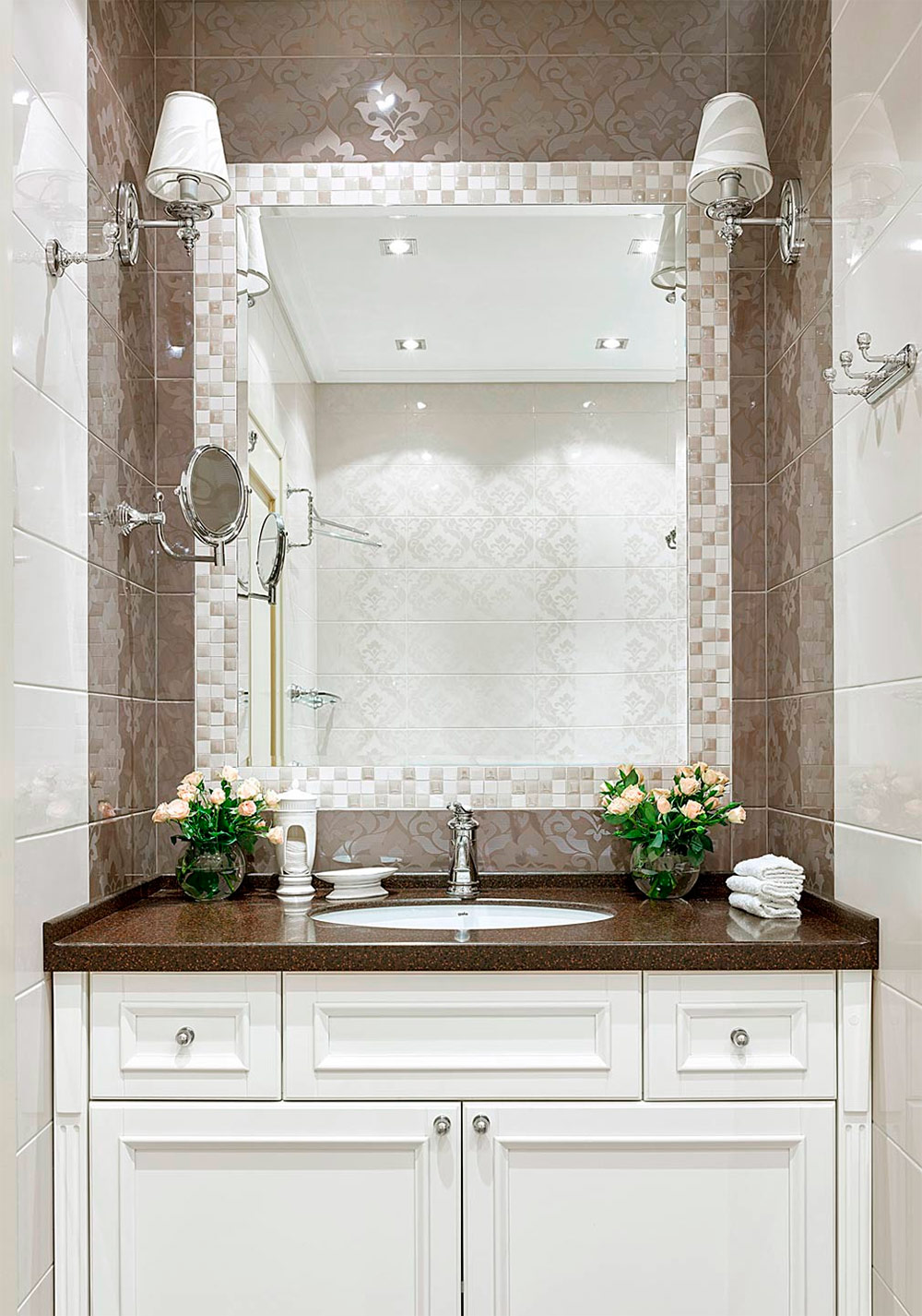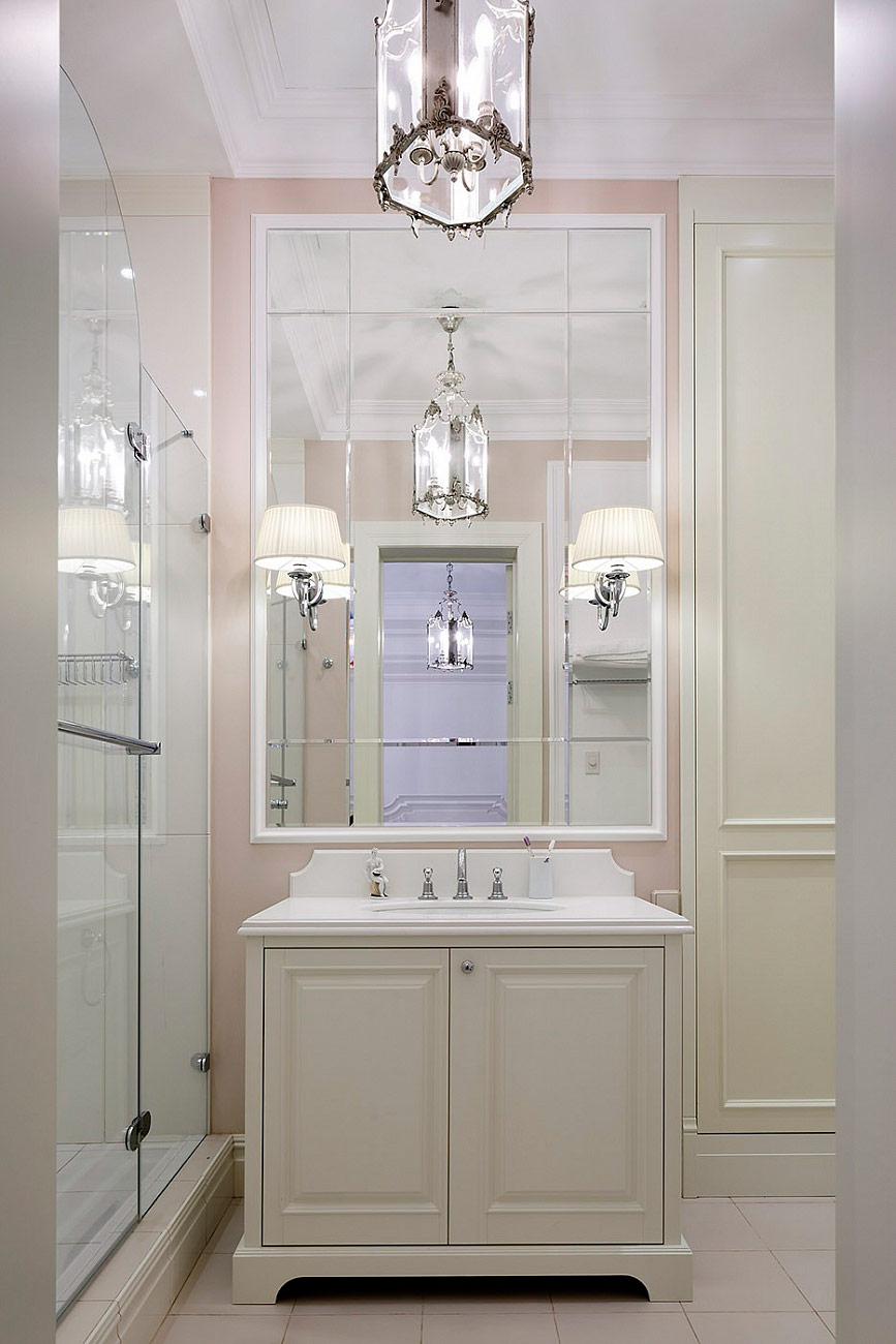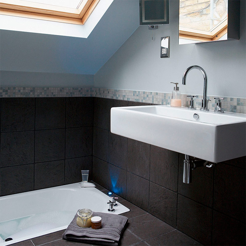 1. L'éclairage est un facteur clé dans la conception de petits locaux. Si possible, envisagez de faire une lucarne dans votre salle de bain - un tel espace sera ouvert, lumineux et spacieux. La garniture blanche reflète la lumière dans toute la pièce. Placez les lumières à côté des miroirs et assombrissez l'espace dans les niches pour créer une ambiance légèrement dramatique. (Assurez-vous que tous les luminaires disposent du degré de protection nécessaire pour une utilisation en toute sécurité dans des locaux humides.)