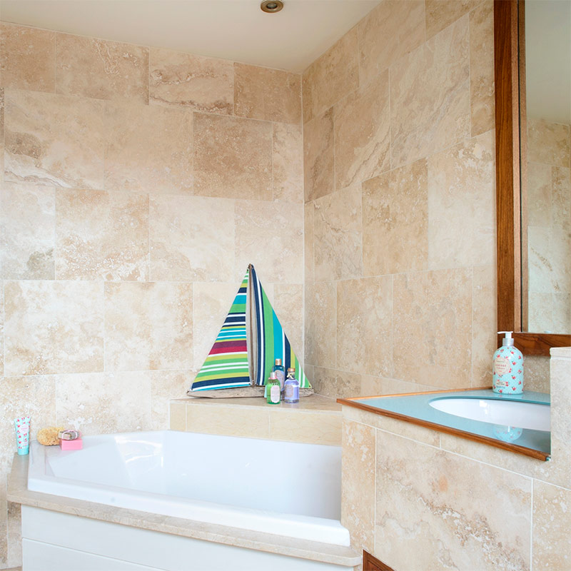 Une astuce délicate pour faire paraître une petite salle de bain plus grande consiste à utiliser le même carrelage sur les murs et le sol. La pierre naturelle, ainsi que les suspensions posées sur le sol, donnent à cette salle de bain un air de spa exquis, et le mouvement continu des carreaux crée une sensation d’espace. Si la pierre naturelle vous semble trop restreinte, vous pouvez facilement raviver l’image avec des taches de couleurs vives sur vos serviettes et accessoires - c’est le moyen le moins coûteux d’ajouter de la personnalité à votre intérieur.