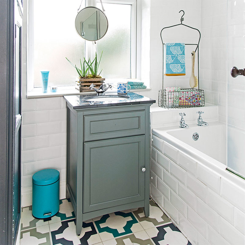 Les meubles volumineux peuvent faire paraître une petite pièce encore plus petite. Achetez donc toujours des meubles à la taille de la pièce. Pour une petite salle de bain, il est préférable de choisir une coiffeuse et un meuble de rangement pouvant être accroché au mur ou installé au bord de la baignoire. N'oubliez pas que l'intérieur doit être unique. Peignez la coiffeuse dans votre couleur préférée, qui s’harmonise harmonieusement avec le fond de dalles de sol à motifs.