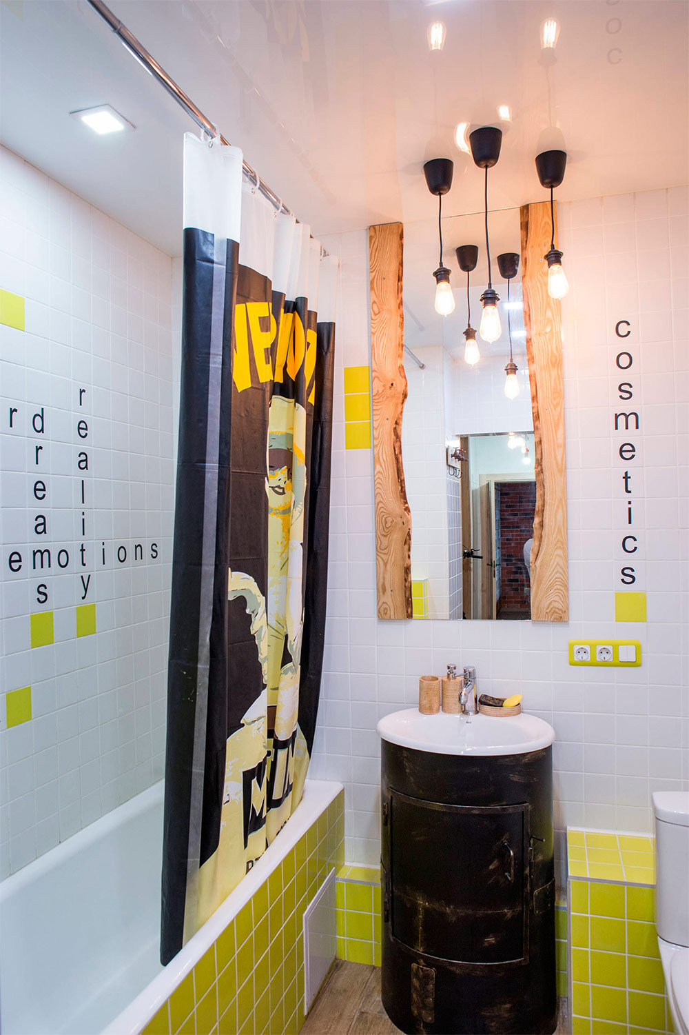 Le panneau de revêtement de cette pièce encadre visuellement la baignoire et la tablette supérieure qui en résulte dans la partie supérieure ressemble à une cheminée. Vous pouvez y placer beaucoup de bibelots, d’articles de toilette et d’accessoires. La couleur verdâtre des panneaux n’est pas un choix aléatoire: cette couleur a un effet relaxant et rend cet espace compact encore plus intéressant.