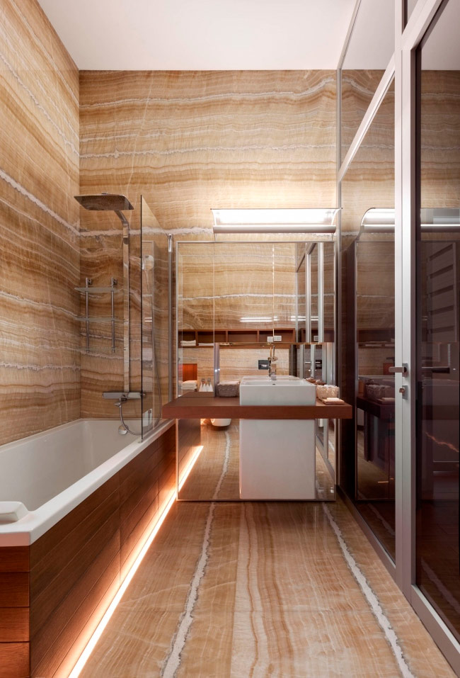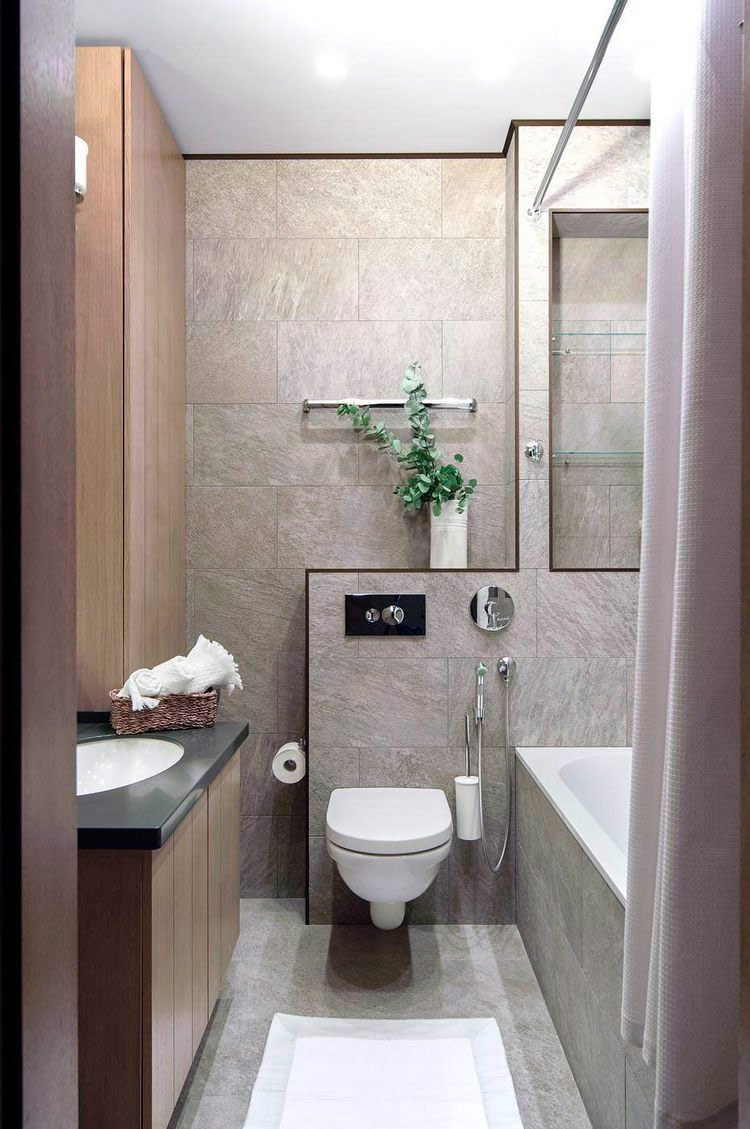 Un petit espace n'a pas à ressembler à ça. Jouez avec les limites de la perception en créant un mur au-dessus de la baignoire et un écran recouvrant de la même manière l'espace sous la baignoire. Cela les rendra difficiles à distinguer, de sorte que la pièce semblera beaucoup plus grande. Les couleurs de marbre sont considérées comme les plus appropriées à ces fins, car les carreaux individuels ne sont pas frappants et ressemblent à un tout.