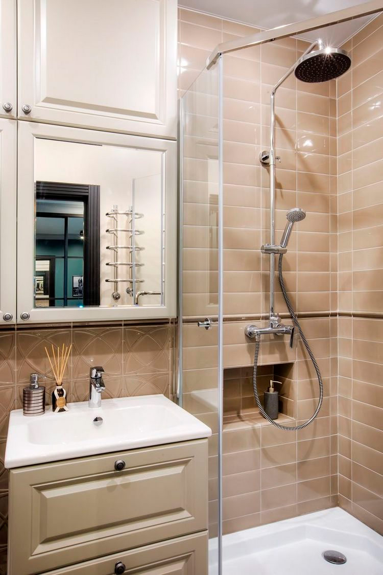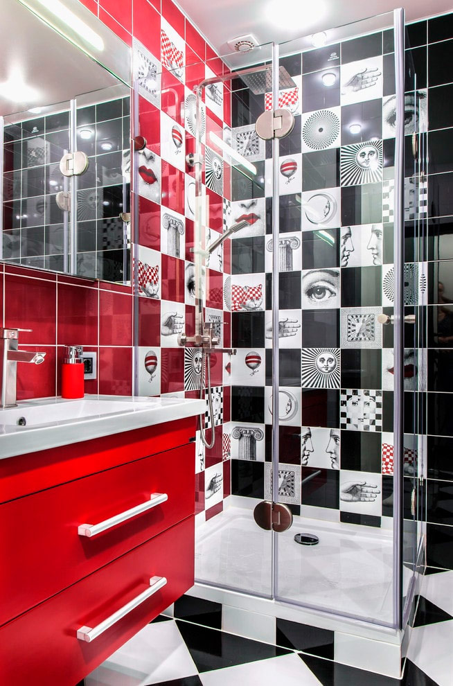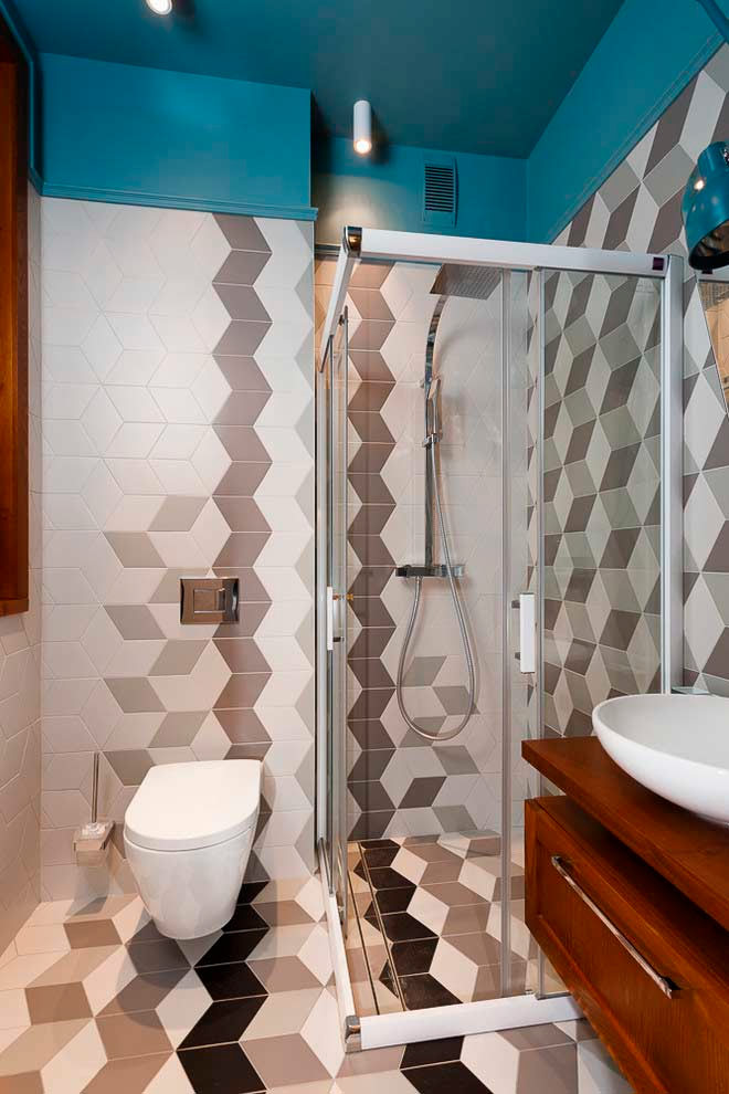 Si l'espace est très limité, privilégiez une cabine de douche - dans ce cas, c'est la meilleure option. Essayez de le placer le long du mur le plus long de la pièce. Utilisez une tuile audacieuse près de celle-ci qui contraste clairement avec le reste de l'intérieur et vous vous rendrez compte que la conception d'une petite salle de bain avec douche peut être vraiment magnifique.