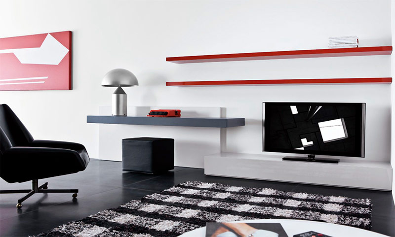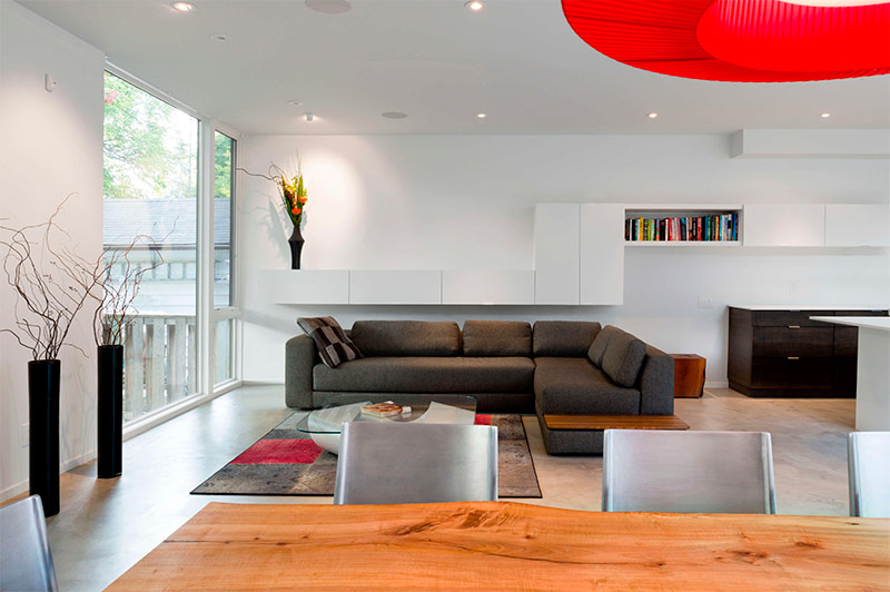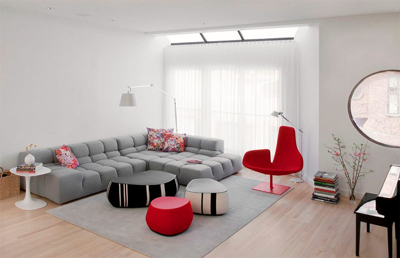Des accents de rouge vif dans la conception du salon dans le style du minimalisme (de Maison d'Amelia).