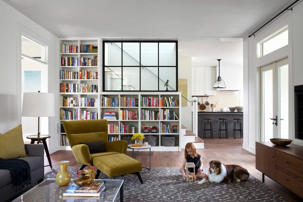 Une combinaison judicieuse de décor blanc et d’étagères noires (de CONTENU Architecture).