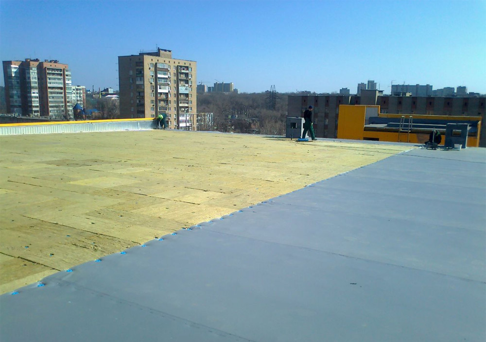 Pour les types de toiture à membrane, il est possible d'utiliser à la fois des dalles de plancher en béton armé et des tôles profilées en métal. Eh bien, l'isolation thermique est mieux faite à partir de laine minérale. Pour ce faire, des plaques dures de ce matériau sont prises ou combinées. La membrane en PVC est installée directement sur la base à travers une couche d’isolant (elle doit être posée séparément). La fixation a lieu aux endroits où des joints sont formés entre les rouleaux de matériau. Les attaches sont utilisées spéciales.