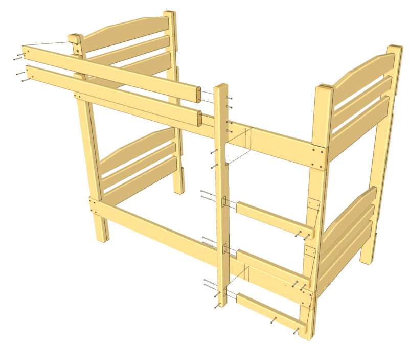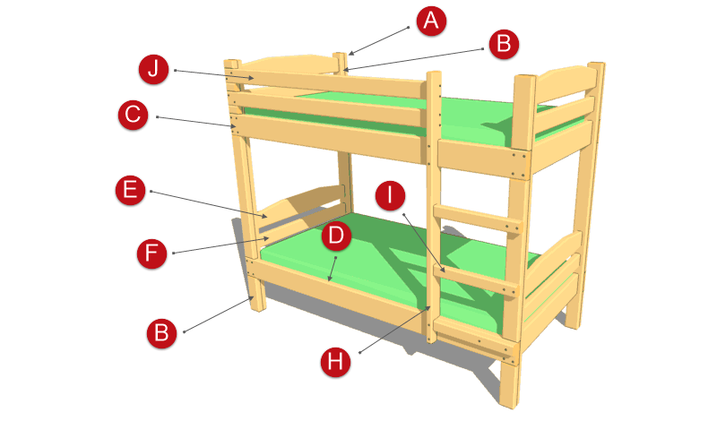 Pour réaliser ce lit superposé, vous aurez besoin de poutres en bois (de préférence en pin) pour la fabrication du cadre. Lorsque vous achetez du bois, assurez-vous que toutes les barres sont droites et bien séchées. S'il y a des défauts sur ceux-ci, il est préférable d'acheter plus que le montant estimé afin de ne pas utiliser les superficies faisant l'objet d'un rejet.