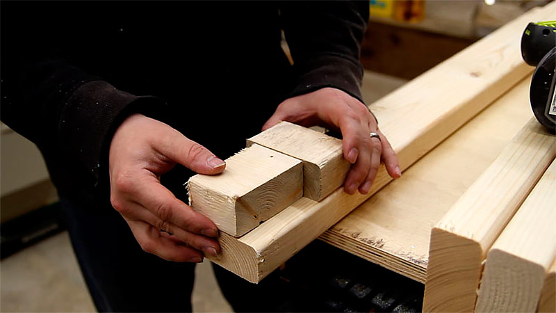 Maintenant, il est nécessaire de fixer de petits blocs de bois sur les jambes, qui soutiendront les couchettes des couchettes à la bonne hauteur lors du montage. À chaque coin du cadre, vous avez besoin d’une telle barre.
