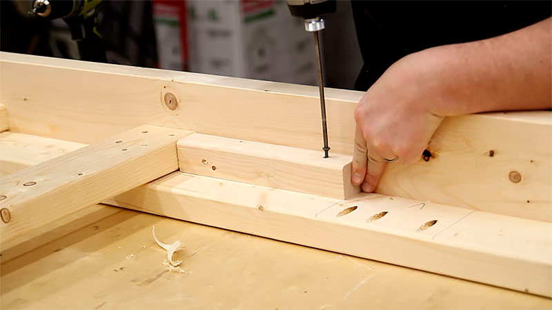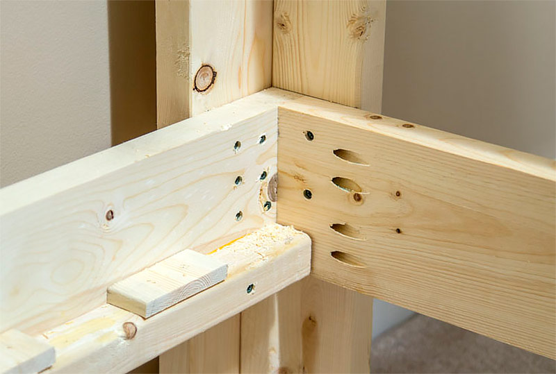 Chaque coin intérieur du cadre de la couchette a été fixé aux pieds à l’aide de 8 vis - deux vis dans un tableau de 5 × 10 cm et six dans un tableau de 5 × 15 cm. Cela peut sembler un peu redondant, mais garantit que le cadre ne se desserre pas avec le temps. Bien sûr, lors du démontage du lit pour le transport, toutes ces nombreuses vis devront être dévissées, mais depuis 99,99% des meubles remplissent leur fonction directe et ne sont pas en transit, ce n’est pas si effrayant.