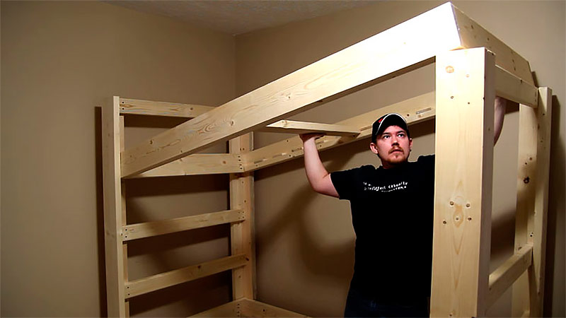 Les marches sont fixées aux pieds du lit au moyen de colle et de vis. L’essentiel à ce stade est de ne pas oublier de s’assurer que les marches sont situées strictement perpendiculaires aux jambes.