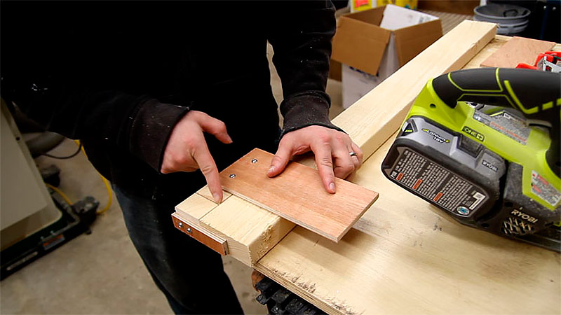 La seconde est pratique lorsque vous effectuez une coupe perpendiculaire. Ceci est juste un morceau de contreplaqué avec un joint en bois, qui est fixé avec une pince à l'extrémité du rail, ce qui vous permet de régler avec précision la position de la lame de scie. Vous pouvez ainsi réaliser des découpes précises et uniformes (et vous aurez besoin de bâtons sciés plus tard).