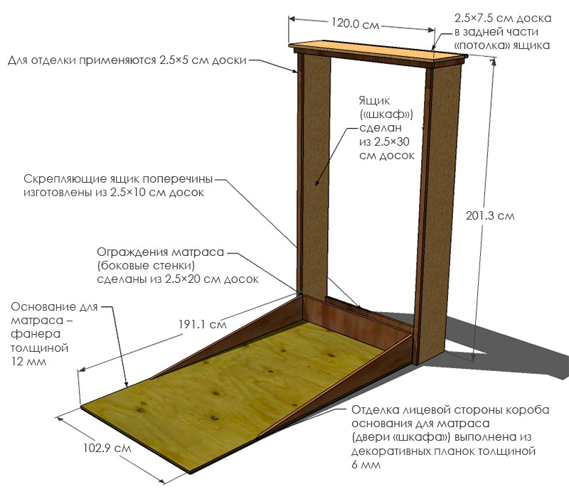 Il est nécessaire de fixer le «boîtier» en vissant plusieurs vis dans le mur à travers les traverses supérieure et inférieure arrière de 2,5 × 10 cm. Nous vous recommandons également de fixer une large bande élastique à la «porte» en contreplaqué, afin que le matelas reste en place lorsque la porte se ferme (le lit se plie).