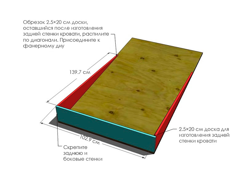Construisez une boîte à matelas en utilisant de la colle et des vis de 50 mm pour relier la paroi arrière d'un panneau de 2,5 × 20 cm au fond en contreplaqué. Ensuite, (encore avec de la colle et des vis), fixez les parois latérales du lit, constituées de bois scié diagonal, au fond et au dos du panneau de contreplaqué. Vous pouvez découper les parois latérales avec une scie sauteuse ou une scie circulaire.