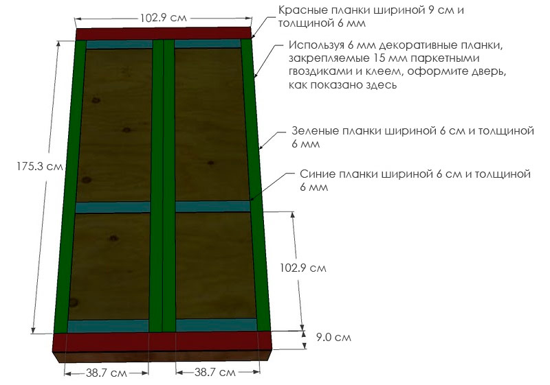 Réfléchissez à la disposition de la porte (à l'arrière du lit) et fixez les bandes décoratives de 6 mm d'épaisseur avec de la colle et des clous de 15 mm sans capuchons. Les dimensions sont pour le modèle montré dans la figure.