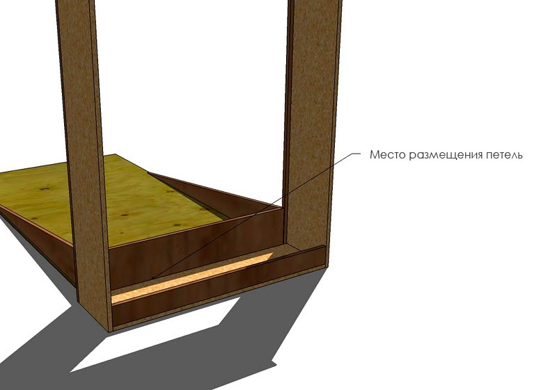 À l’aide de clous et de colle de 50 mm, fixez l’arrière de la boîte «plafond». Les extrémités de la bande doivent déborder de manière uniforme au-delà des parois latérales (~ 2,5 cm) et son bord de fuite doit être au même niveau que les bords de fuite des parois latérales.