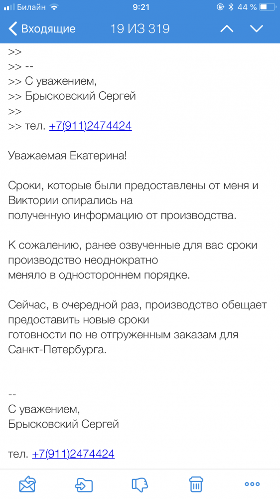 Nous sommes spécialement venus plusieurs fois au salon pour demander des éclaircissements sur les conditions de production. Fin février, ils ont signé un accord. Pendant la période de fabrication de la porte, des réparations ont été effectuées, d'autres meubles ont été nettoyés et fermés. Le responsable n'a même pas daigné nous appeler à l'heure. Ils se sont appelés - elle s'est trompée, la porte arrivera un mois plus tard.