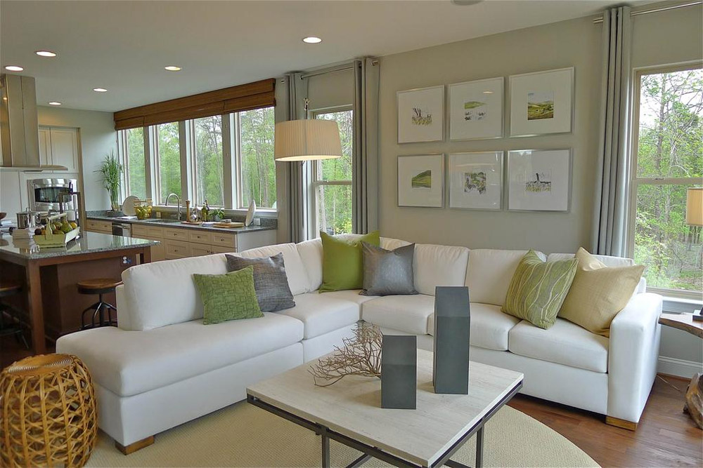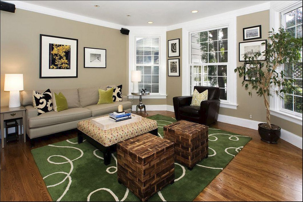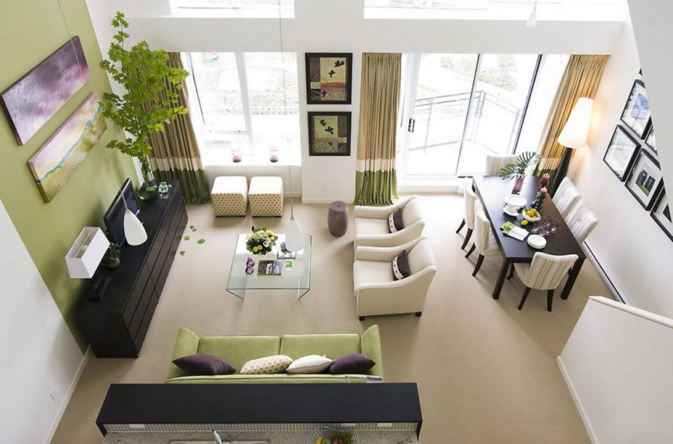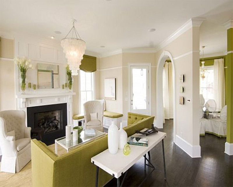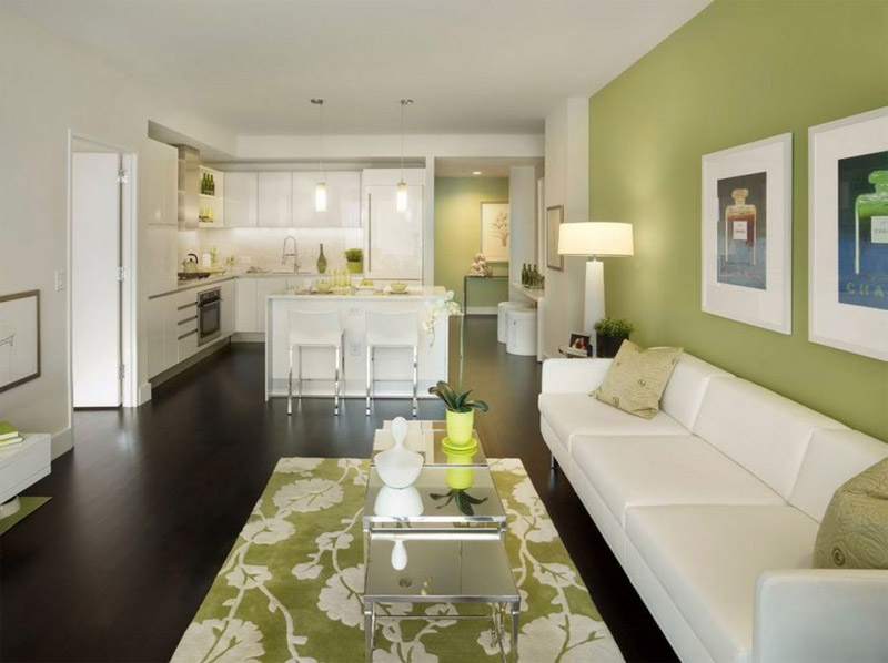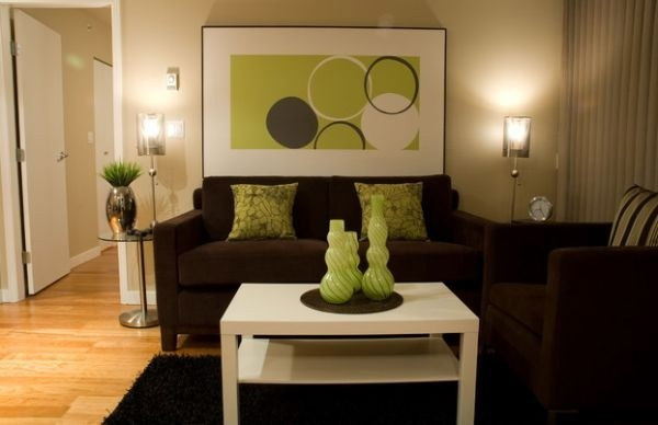 Appelgroen decor op een gemeenschappelijke lichte achtergrond van de woonkamer.