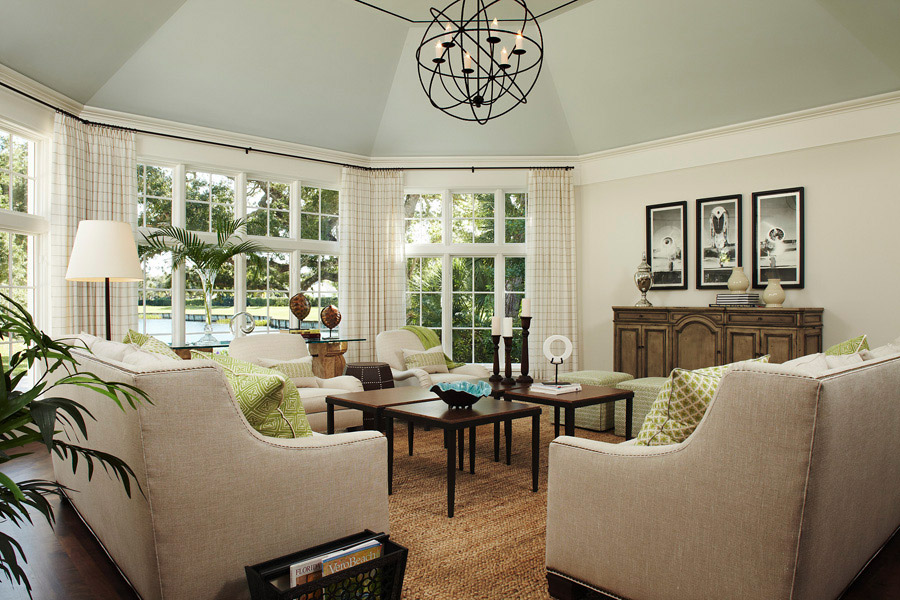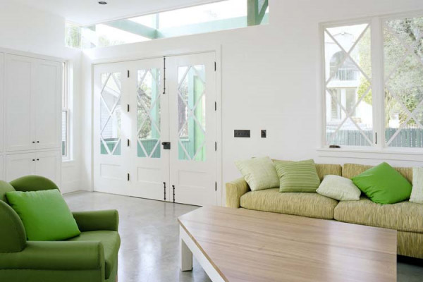 De contrasterende groene kleur van de fauteuil en kussens geeft frisheid aan deze kamer in neutrale kleuren.