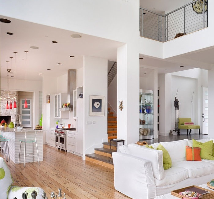 Eenvoudige toevoegingen van limoengroene kleur vallen op dankzij de gedempte achtergrond van het interieur.