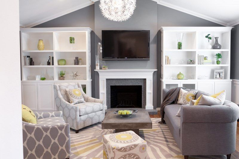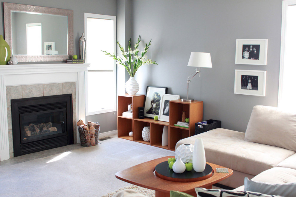 Grijze woonkamer met zachte vlekken van geel en groen.