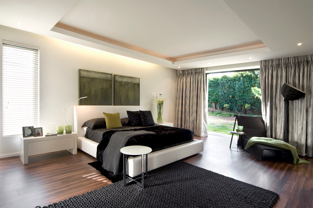 Slaapkamer in zwart en wit met groene stoffenaccenten.