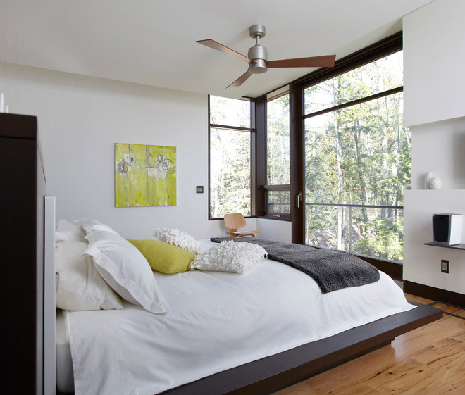 De Bertoia Diamond fauteuil voegt groene frisheid toe aan deze grijze slaapkamer.