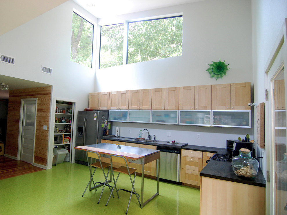 Glanzende groene vloeren bieden een unieke manier om kleur toe te voegen aan uw keuken.