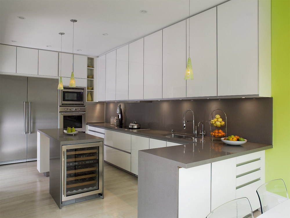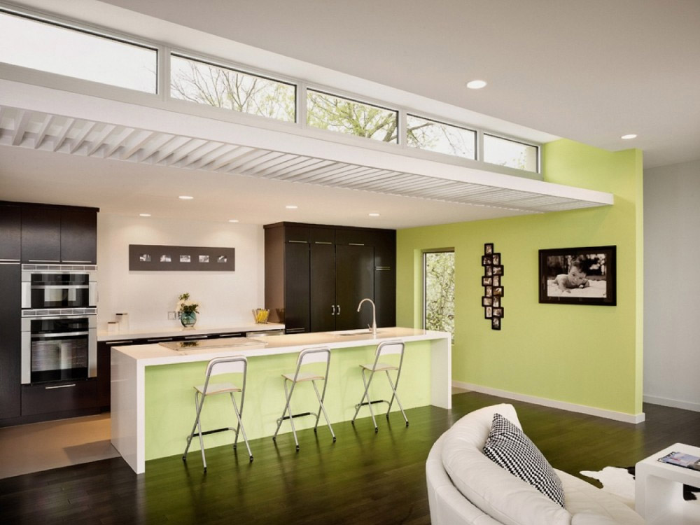 Een moderne keuken, die delicate tinten licht citroengroene kleur gebruikt.