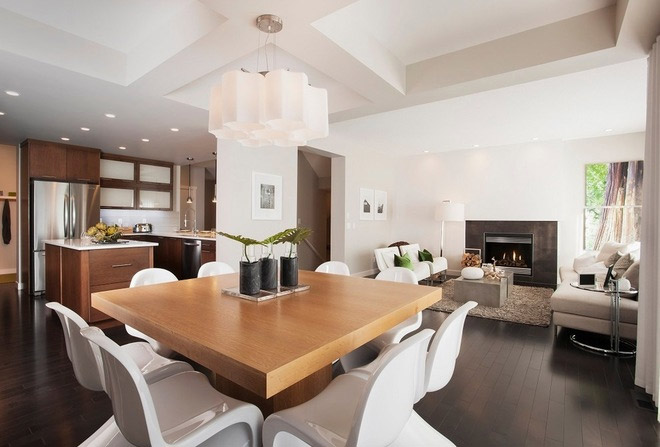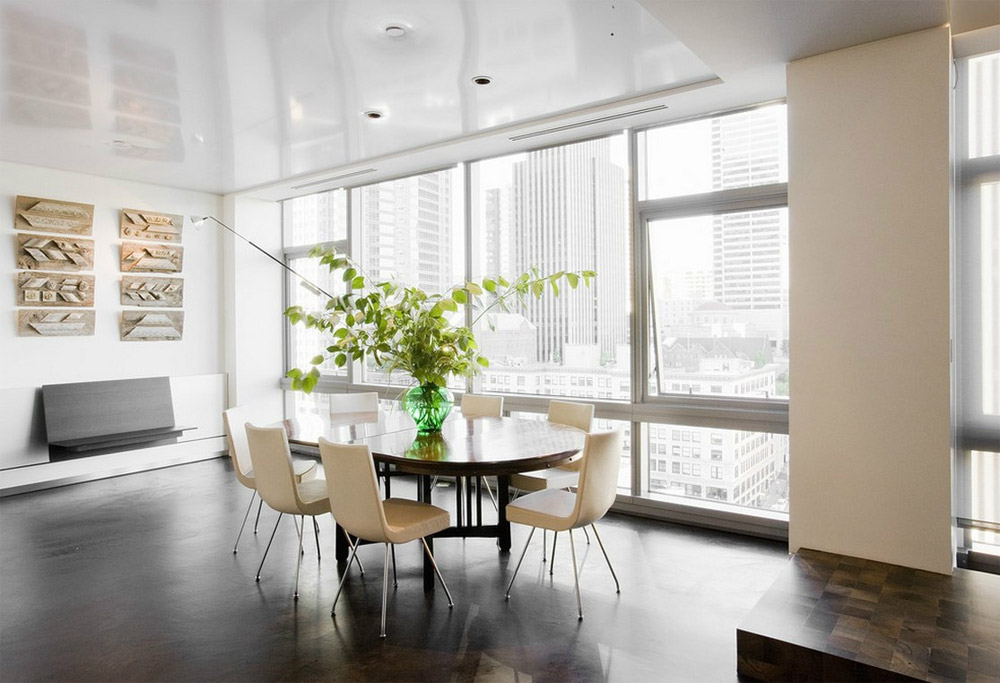 Potplanten op de eettafel en bankkussens worden gebruikt om subtiele accenten van groen toe te voegen.
