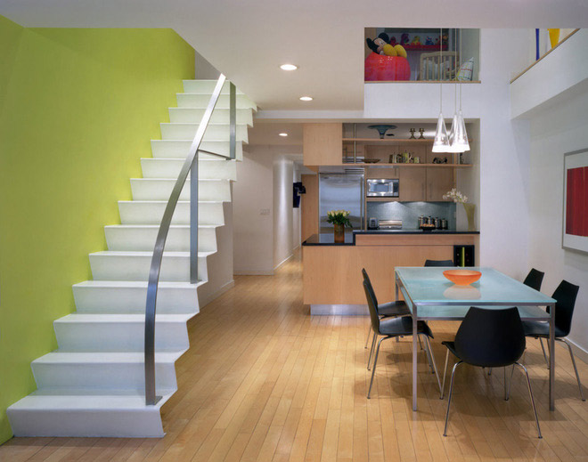 Een mooie geelgroene muur maakt van de trap een stijlvol beeld dat meteen de aandacht trekt.