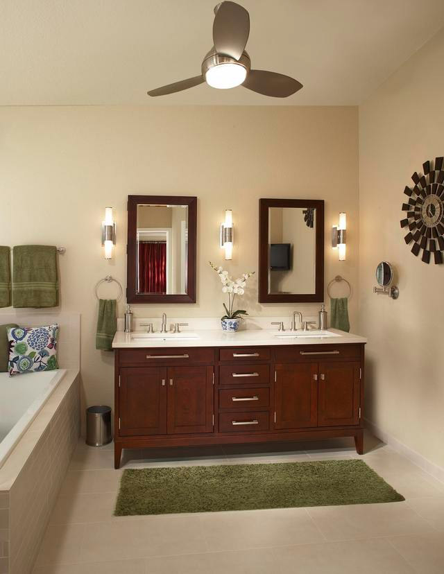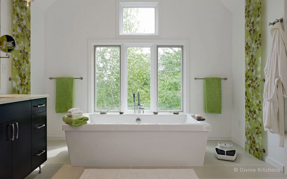 Handdoeken en een kleed zijn de eenvoudigste manier om groene accenten toe te voegen aan een gedempte badkamer.