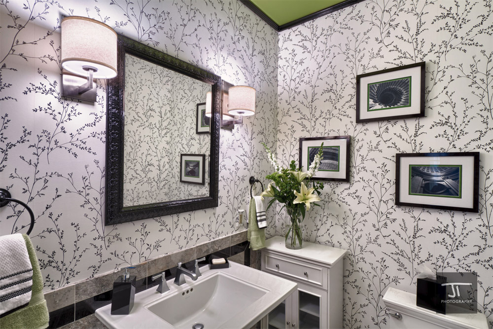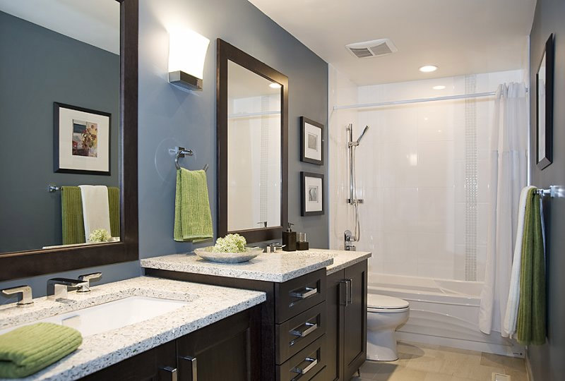 Spiegels en de groene kleur van de muren in het interieur van de badkamer benadrukken de aantrekkelijkheid.