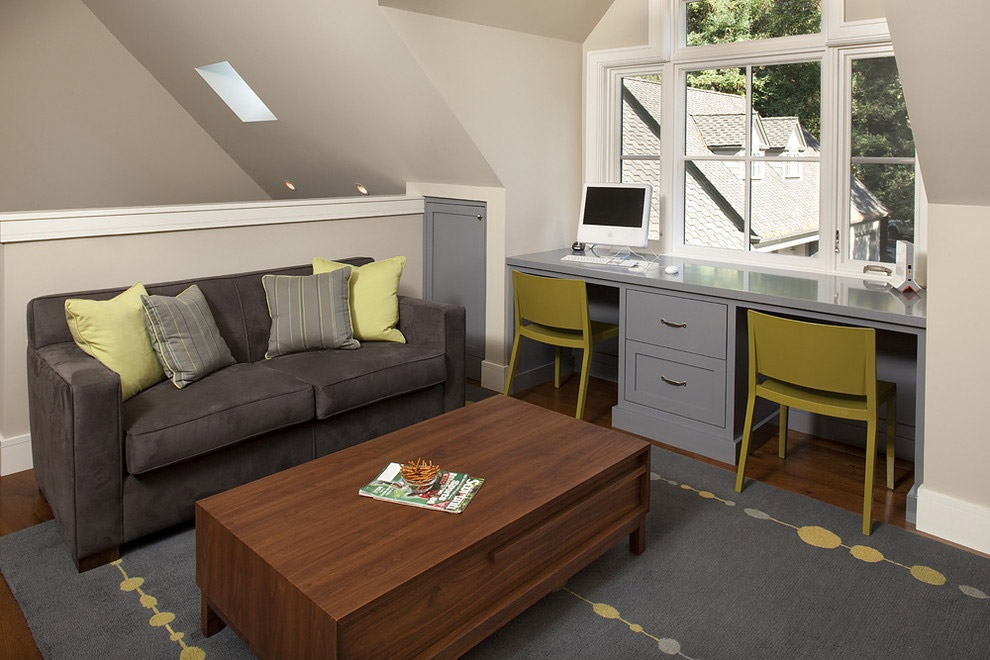De groene en blauwe kleuren gebruikt met wit en grijs geven de eigenaren van deze woonkamer een vrolijke sfeer.