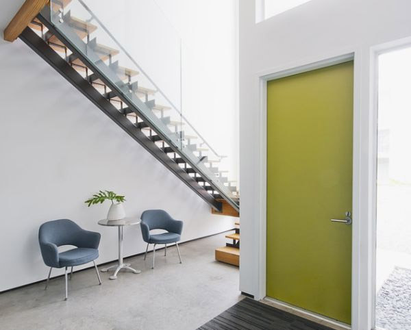 Voeg helderheid toe aan de gang met een groene deur die opvalt tegen een neutrale achtergrond.