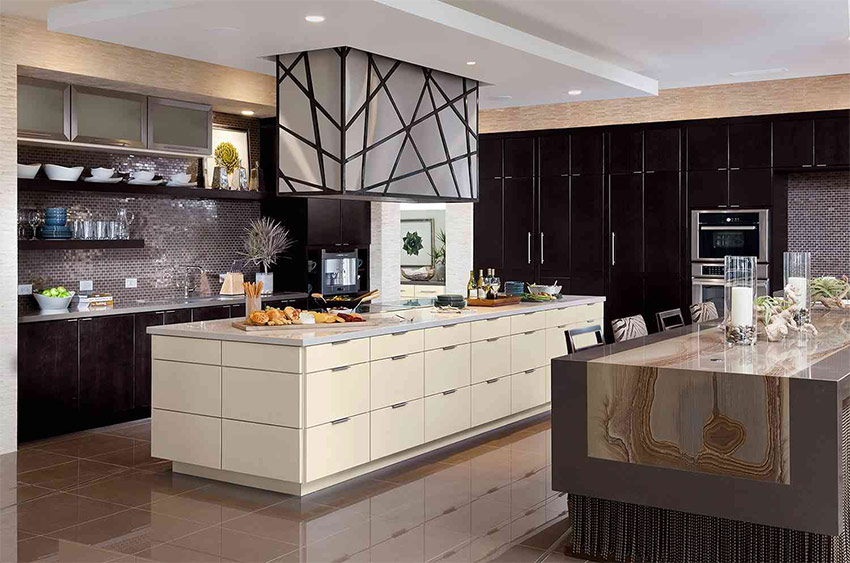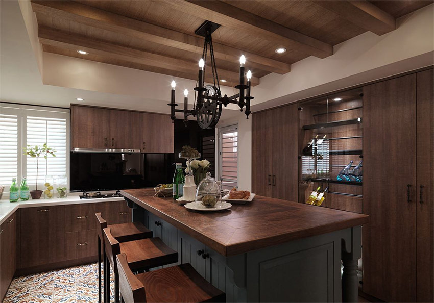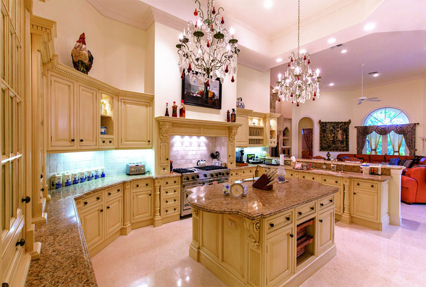 Een keuken met een traditioneel eiland in het midden van de kamer en chique kristallen kroonluchters met robijnrode hangers in Art Deco-stijl.
