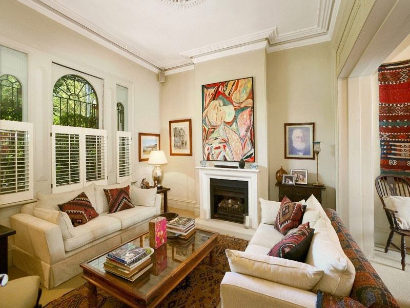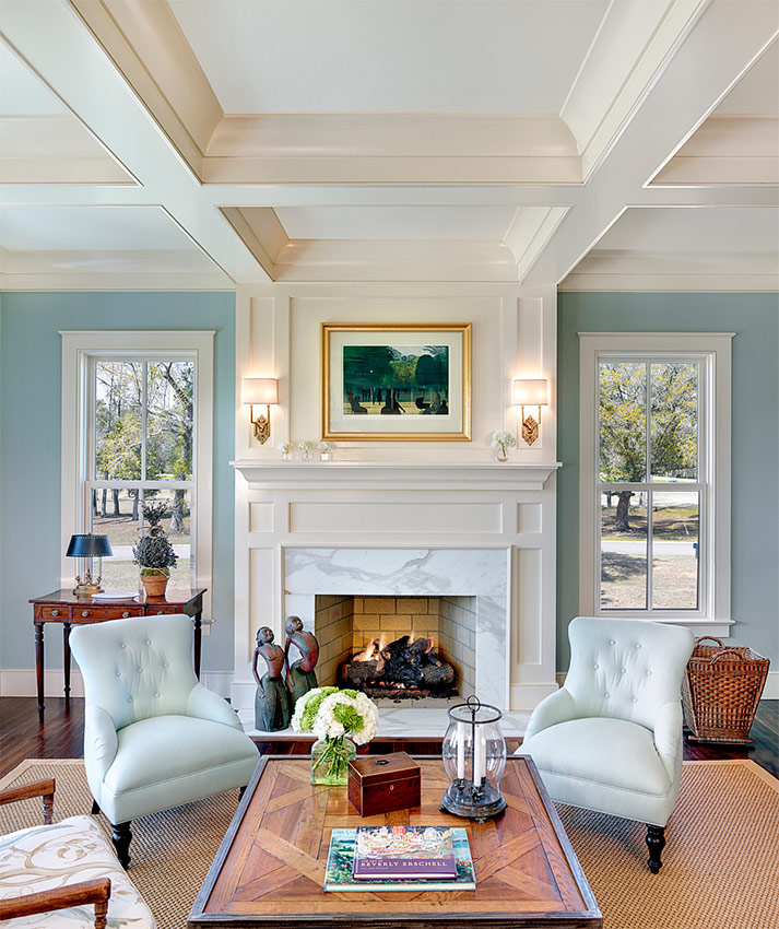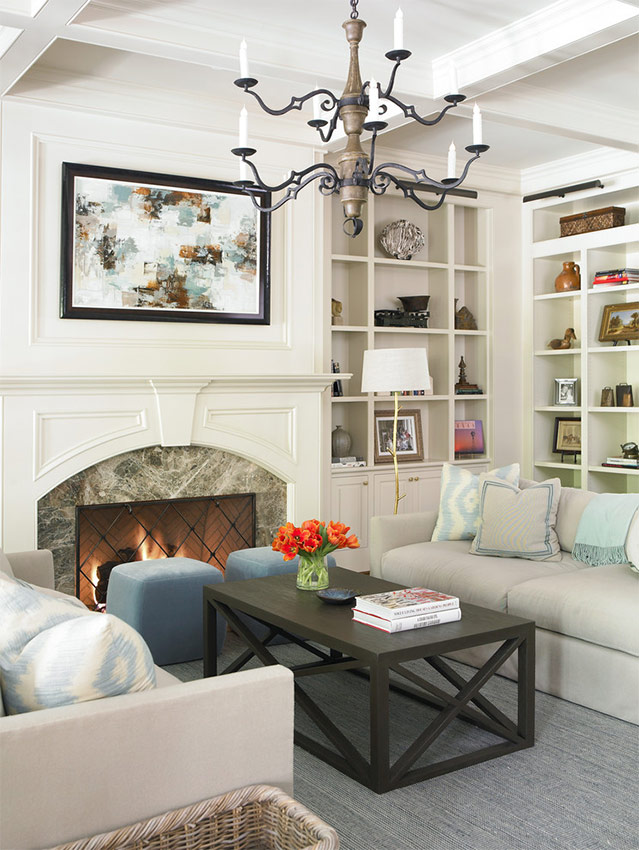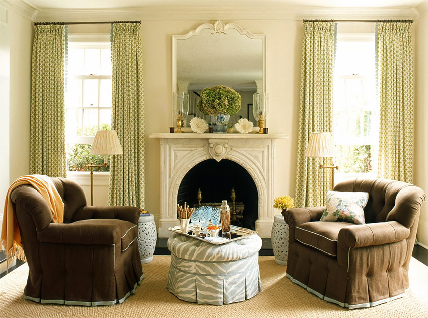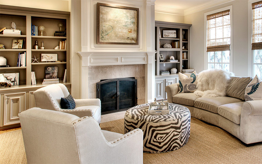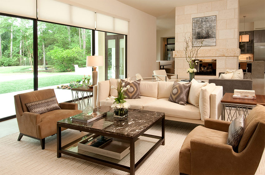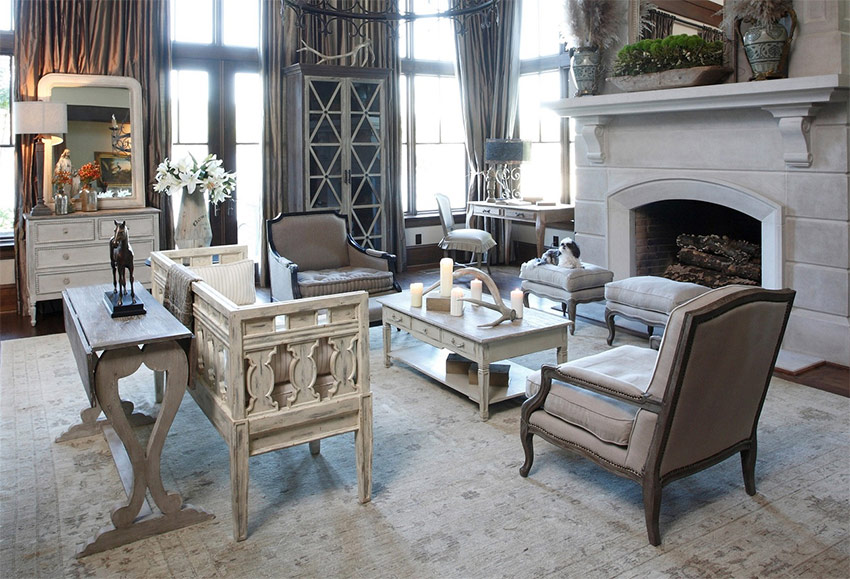 Ten eerste wordt het niet langs de muren geplaatst. In grote kamers is er voldoende ruimte om een bank en verschillende fauteuils in het midden van de kamer te zetten, waarrond de rest van het meubilair wordt georganiseerd.