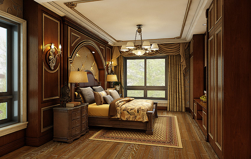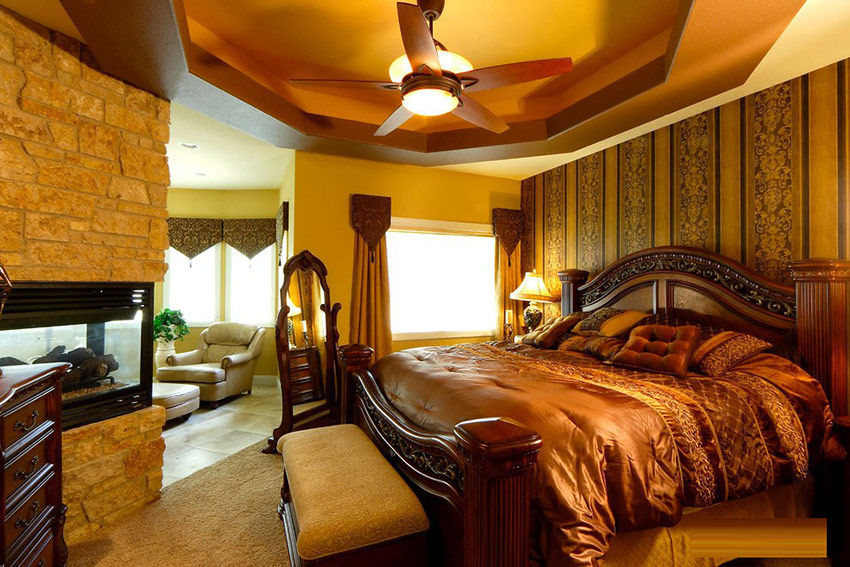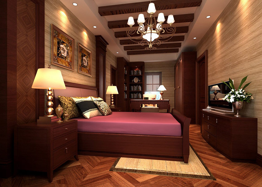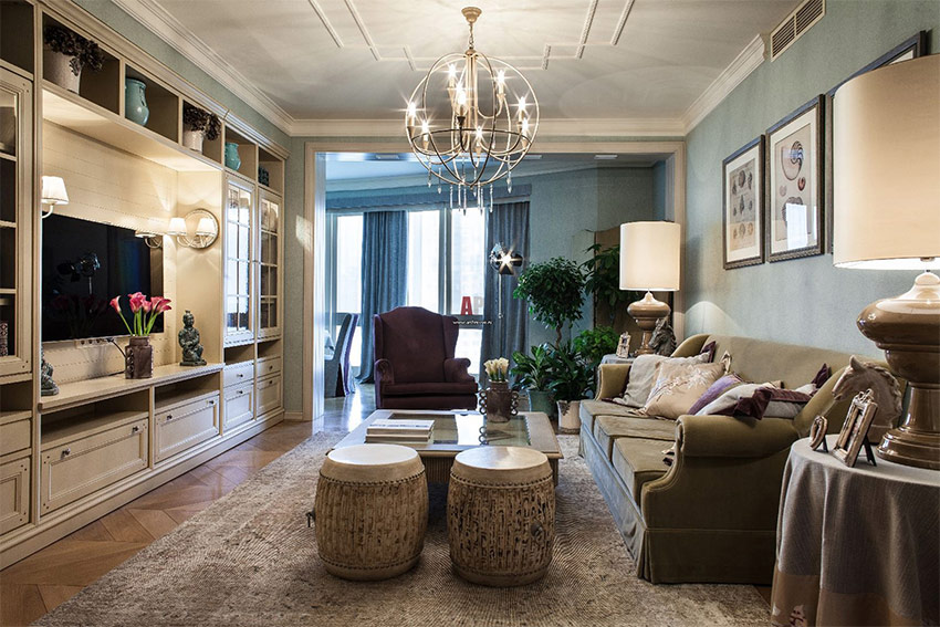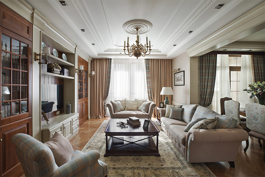 - het gebruik van een grote kroonluchter met meerdere paden met ophangingen in het midden van de slaapkamer, woonkamer of eetkamer;