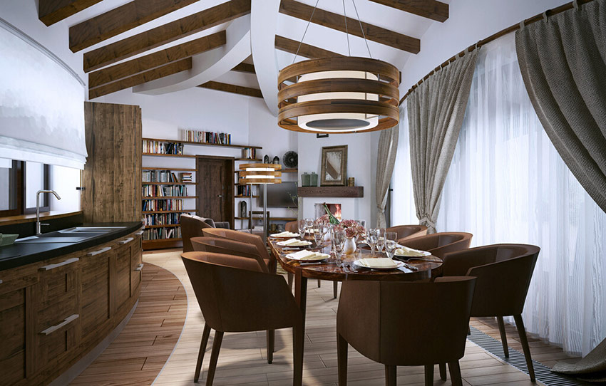 - versieren van witte hoge schuine plafonds met houten balken;