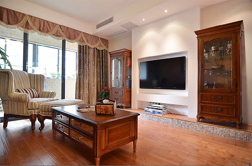 Het is onmogelijk om de klassieke Amerikaanse stijl in het interieur te belichamen zonder een goed textielontwerp. Voor gordijnen is een effen natuurlijke of gemengde stof geselecteerd, soms met een klein geometrisch patroon, een rechtlijnige rechte snit is kenmerkend. Weelderige lambrequins en ruches voor ramen in de Amerikaanse stijl zijn niet vreemd. Het is mogelijk om Romeinse, Japanse gordijnen of jaloezieën te gebruiken.