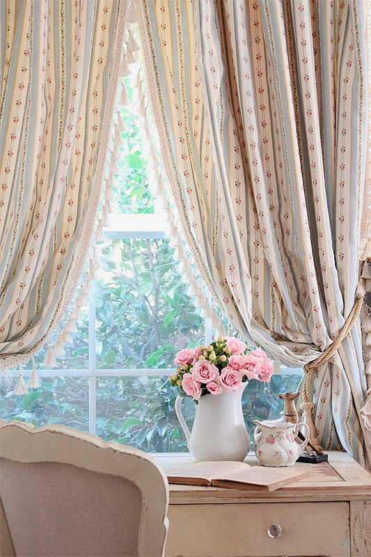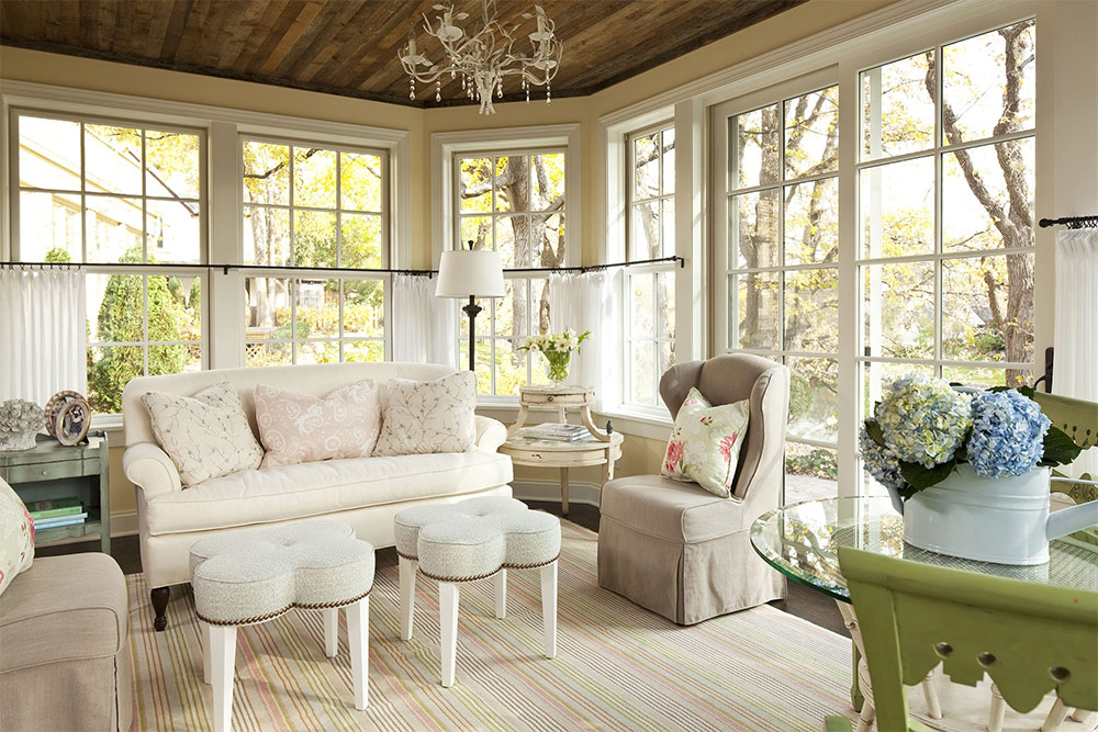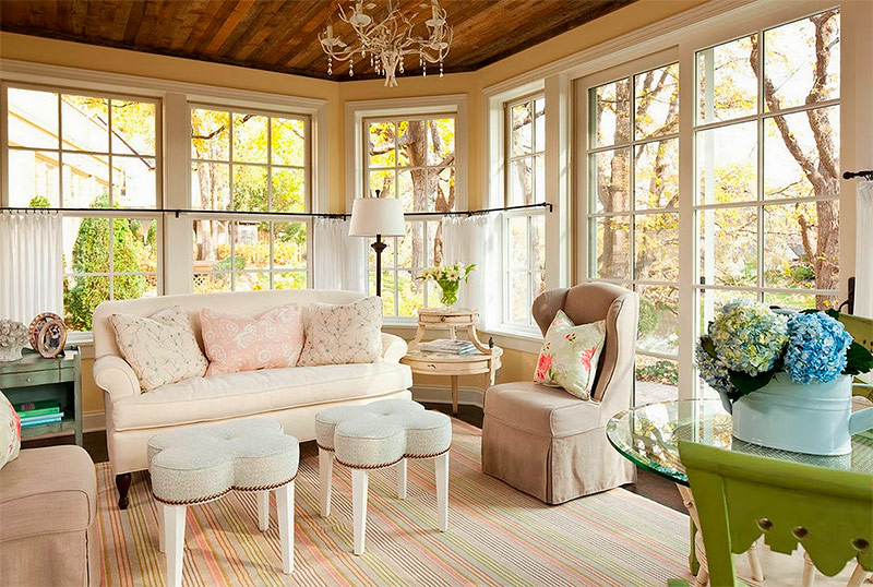 7. Et annet trekk ved stilen er overfloden av tekstiler. Stilen, selv om den er skapt av modernitet, støtter ikke strenge former for minimalisme eller kulden i høyteknologien. Gardiner og sengetepper skal være koselige, vakre, med lette stofffalser. Stoffet for å dekorere vinduer er valgt for det mest mangfoldige, basert på den generelle konteksten av designen. Et tungt tett gardin med dusker langs kanten, et lett gardin med mønster med roser, en transparent gardin med hvit farge vil passe inn.