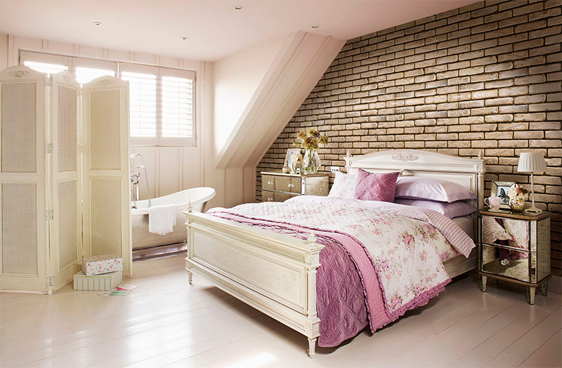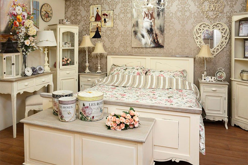 Fokuset er på utformingen av sengen. Grunnlaget er vanligvis tatt en kombinasjon av hvite og pastellfarger. For eksempel askerosa. I denne vene er det valgt sengetøy, sengetepper, deksler til ruller og puter. Vanlige og mønstrede stoffer veksler. En lys seng kompletteres av tette dekorative puter som gjentar mønstre. Gardiner kan være tette monofoniske, beskytte mot sterkt lys eller helt vektløse. For eksempel fra organza eller chiffon.