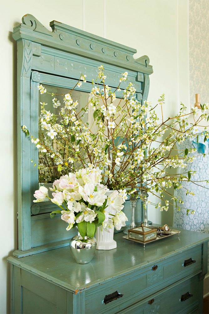 3. Kompletter rommet med utsøkt innredning. Det spiller en viktig rolle i helhetsbildet av interiøret. Det skaper det endelige inntrykket av tidligere luksus og rikdom. Shabby Chic-leiligheter er elegant innredet med gamle karaffel og tjenester, friske blomster (de mest sofistikerte og velduftende), trekister med et bilde av roser på overflaten.