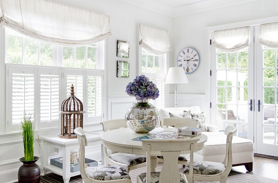 Tips: ikke vær redd for å legge maling til det hvite interiøret. Helhetsinntrykket av at rommet skal skape bør ligne en gammel porselenstjeneste med roser. Noen uskarpe fargeflekker på hvit bakgrunn.