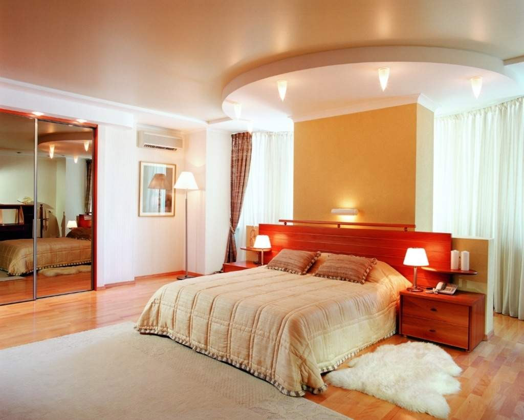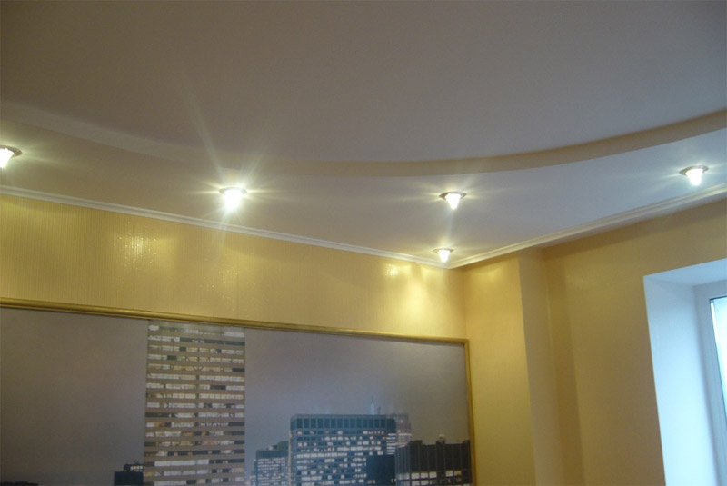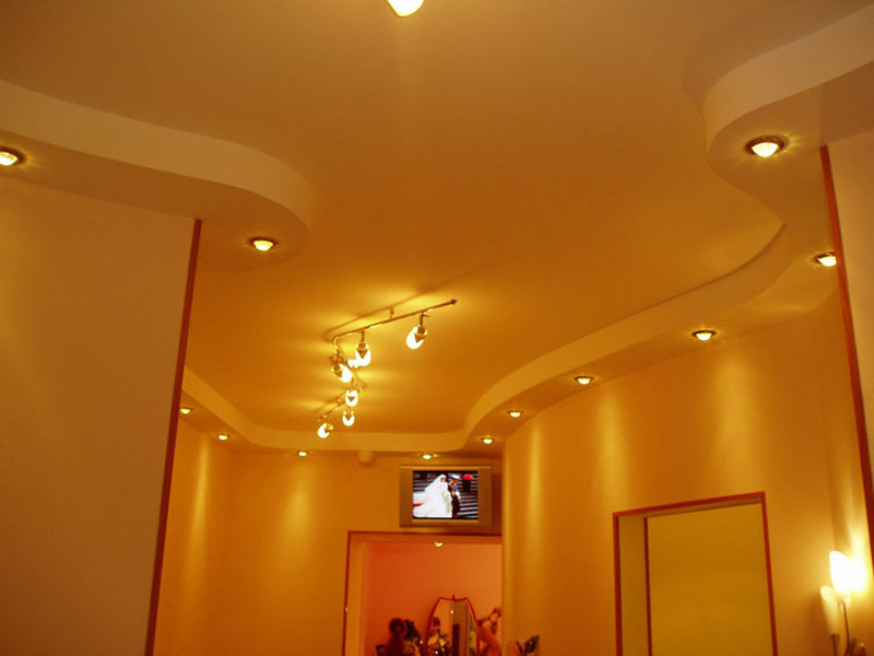 Rien de compliqué - c'est juste une boîte en une ou deux étapes. Parfois, il n'a pas une forme rectangulaire, mais bouclée. Une telle boîte a une épaisseur allant jusqu’à 50 centimètres, située le long de tous les murs de la pièce. Des lumières cachées sont placées à l'intérieur de son périmètre et des projecteurs sur les LED sont placés au centre de la boîte. Au lieu d’un éclairage ponctuel, il est possible d’utiliser un lustre installé au centre de la pièce.