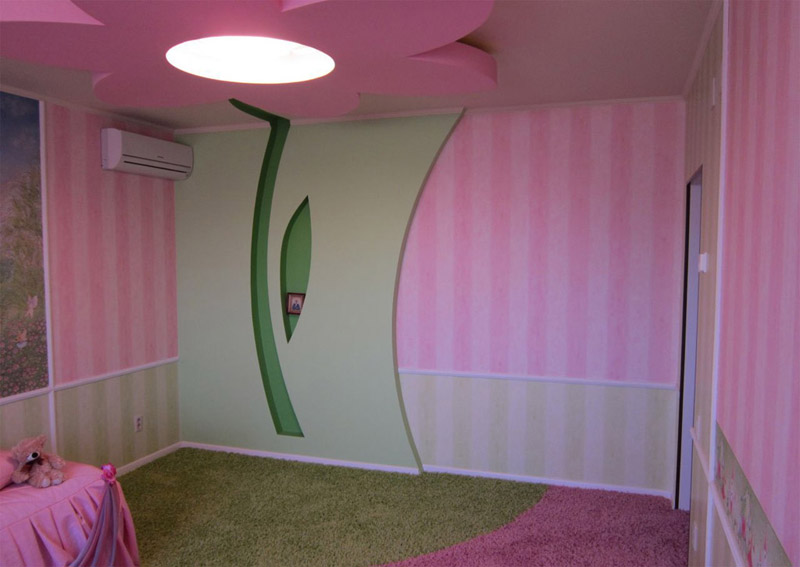 Ici, sur un fond de base uniforme, un dessin figuré se démarque - par exemple une fleur ou une figure géométrique complexe. En règle générale, un tel élément est placé au centre du plafond, en le soulignant le long des bords (le long des plans verticaux). La figure est généralement faite par le deuxième ou troisième niveau (et capture parfois les deux).