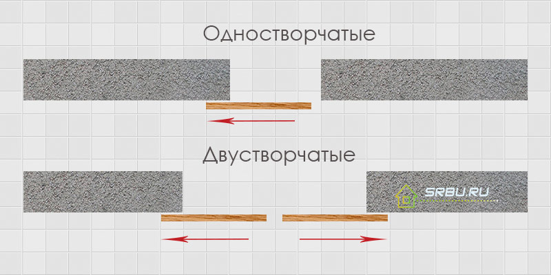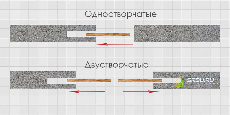 Eles são de folha única ou bivalves. Modelos de porta única movem-se ao longo dos trilhos paralelos à parede.As estruturas bicúspides funcionam de maneira semelhante, com a única diferença de que suas telas estão se afastando em direções diferentes umas das outras.