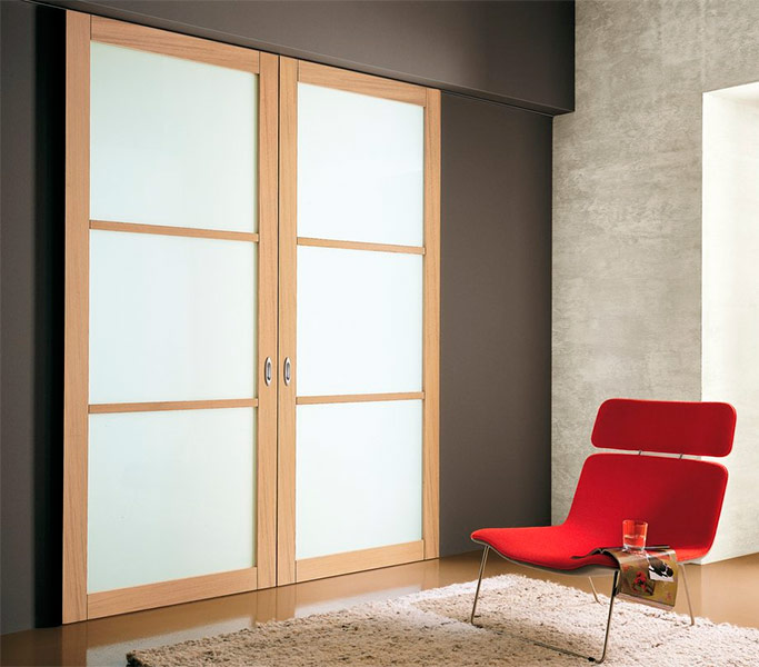 Tais modelos são feitos sob encomenda. Os materiais mais populares para folhas de porta são vidro ou espelhos. A estrutura de vidro confere leveza e graça à sala e também contribui para o aumento da iluminação natural do espaço. Uma porta espelhada dobra visualmente o volume da sala.