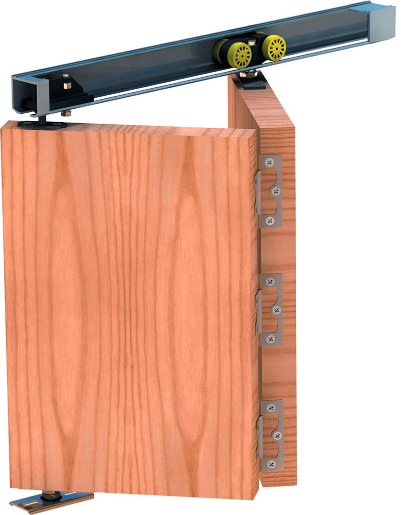 Esse mecanismo envolve mover a porta dos roletes em apenas um trilho localizado acima da porta. Sua instalação deve ser realizada apenas em paredes fortes e confiáveis. O design deste sistema deslizante inclui um perfil de alumínio, um kit para montagem da estrutura, mecanismos de roletes e elementos de travamento. O cálculo do número de rolos é realizado de acordo com o seguinte esquema: para uma porta com peso de até 70 kg, um conjunto será suficiente, com um peso maior, é necessário aumentar o número de rolos de acordo.