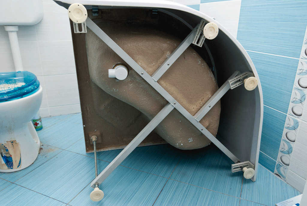 Maintenant, inspectez le receveur de douche. Nous avons installé un receveur de douche avec une base haute, mais les méthodes d'installation sont les mêmes pour tous les types de receveurs. Comme vous pouvez le voir sur la photo, la base comporte plusieurs pieds réglables, permettant ainsi un alignement lors de l'installation.