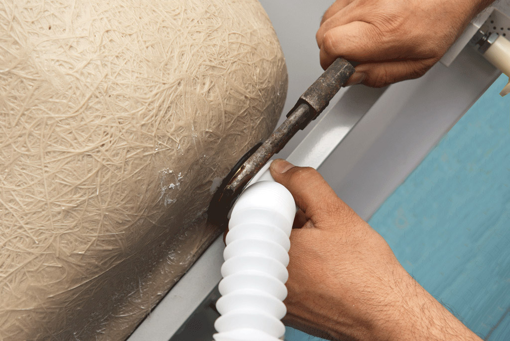 Faites attention au trou de vidange. En règle générale, ils essaient de le positionner au-dessus du drain dans le sol. Dans notre cas, ce n’est pas le cas, donc, pour les connecter, nous avions besoin d’un tuyau flexible assez long.